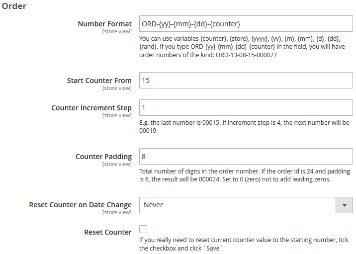 You can set order number prefix, postfix even can use custom text in the middle. You can also you order time as number. This feature allow you to set numbering as your heart desire. You can also set the number of digit will take as counter. If you set padding to 3 and if you have a order starting with 5, then its number will be 005.