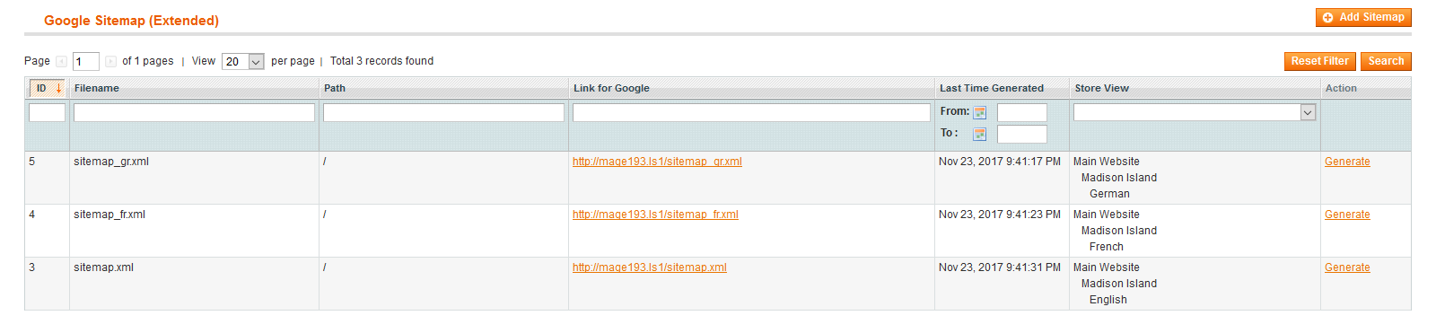 You can easily generate sitemap for induvial store with just one click. Just click on generate link and it will generate sitemap. You can also add as many site map as you like for your multiple stores.