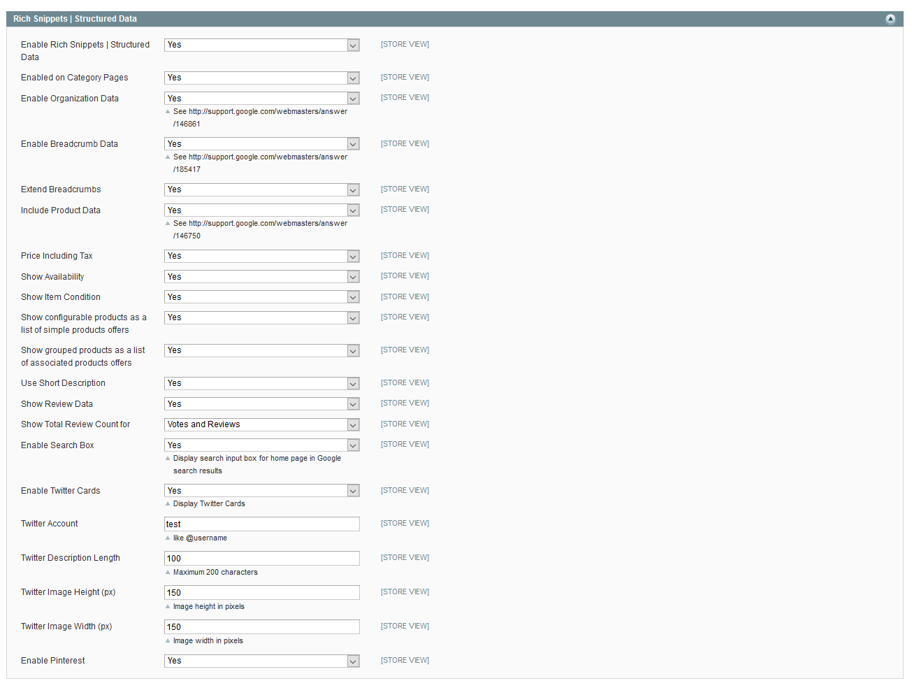 Our extension support all necessary structured data for you Magento sore, like price, availability, currency, review with ratings, breadcrumbs, category, organization etc. it also supports Twitter card and Pinterest.