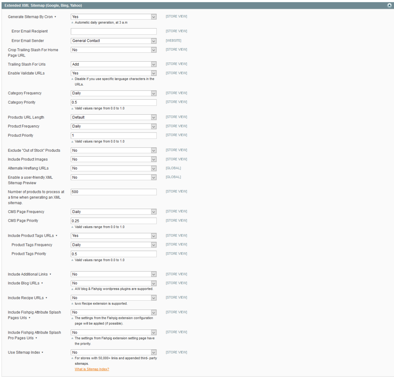 Our extended sitemap is fully customization. You can configure you sitemap out put according to your need. You can set frequency and priority for all links, Include / exclude product’s image, out of stock product, product’s tag, add custom links, how many product should process at once etc. you can also set validity check and mail recipient for send mail to if error occurred.